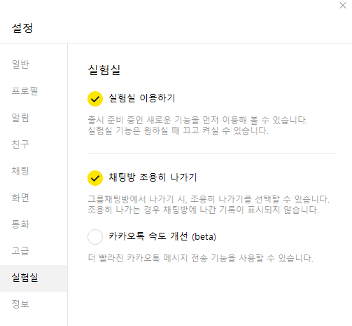 4. 실험실 이용하기 버튼을 활성화 한 후 채팅방 조용히 나가기 버튼도 활성화해줍니다.