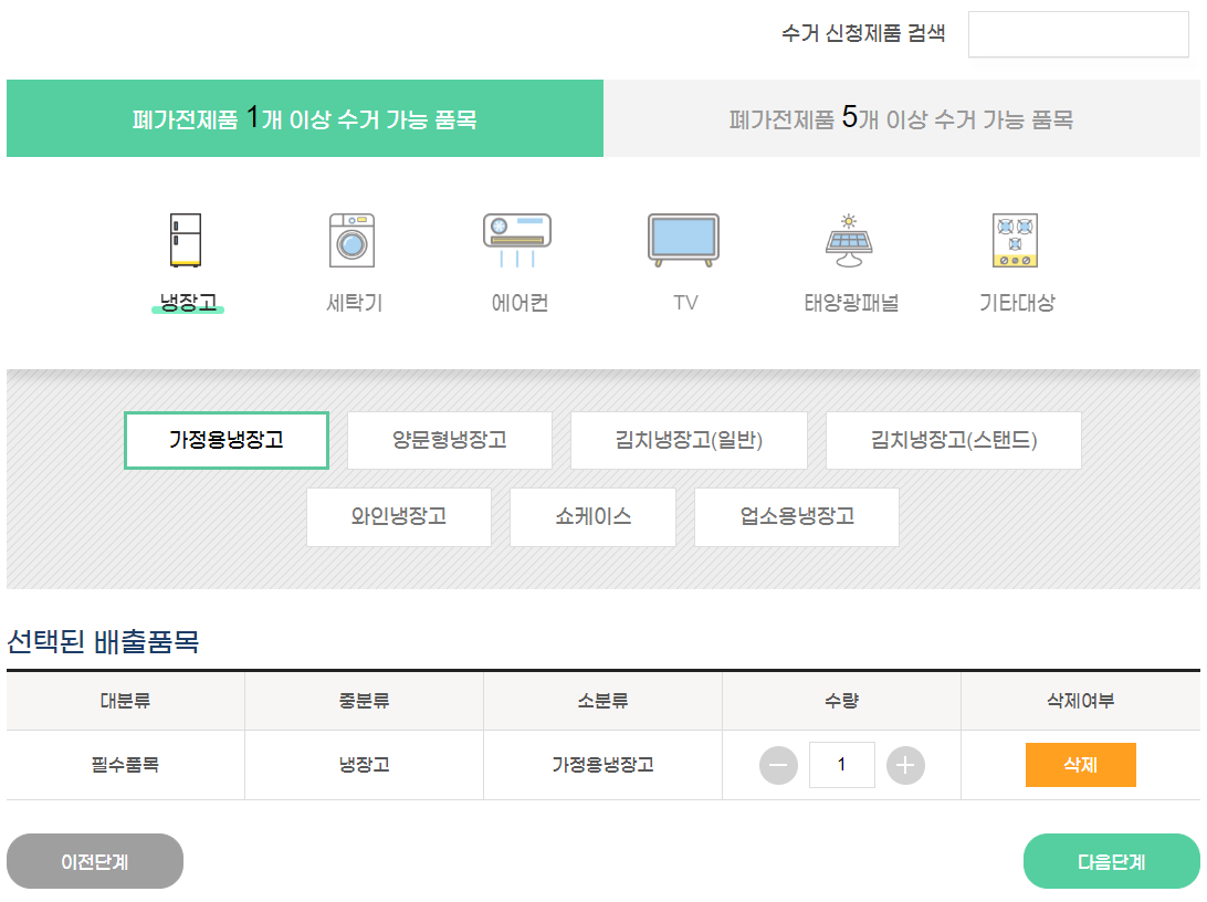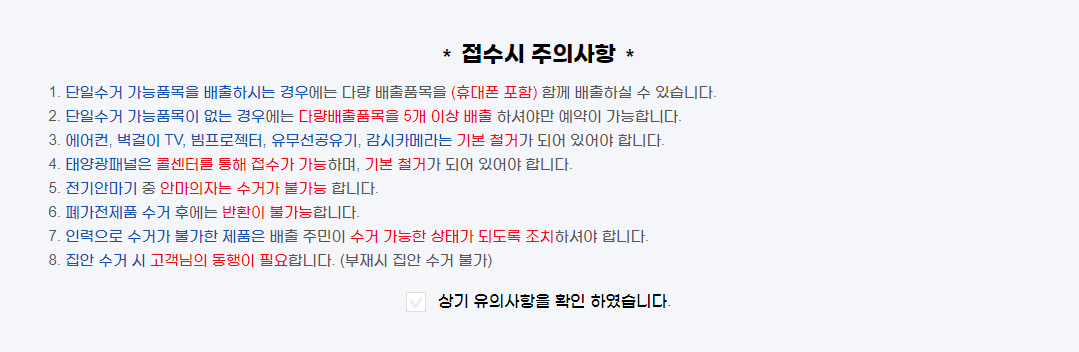 단일수거 가능품목을 배출할때는 다량 배출 품목과 함께 배출할수 없습니다. ex) 냉장고+휴대폰 불가능 / 냉장고+세탁기 가능 또한 단일수거 가능품목이 없는 경우 다량배출품목 5개 이상 배출하셔야 예약이 가능합니다. ex) 컴퓨터+프린터2개+휴대폰 2개 추가로 에어컨, 벽걸이 TV, 빔프로젝터, 유무선공유기, 감시카메라는 기본적으로 철거가 되어있어야 합니다.