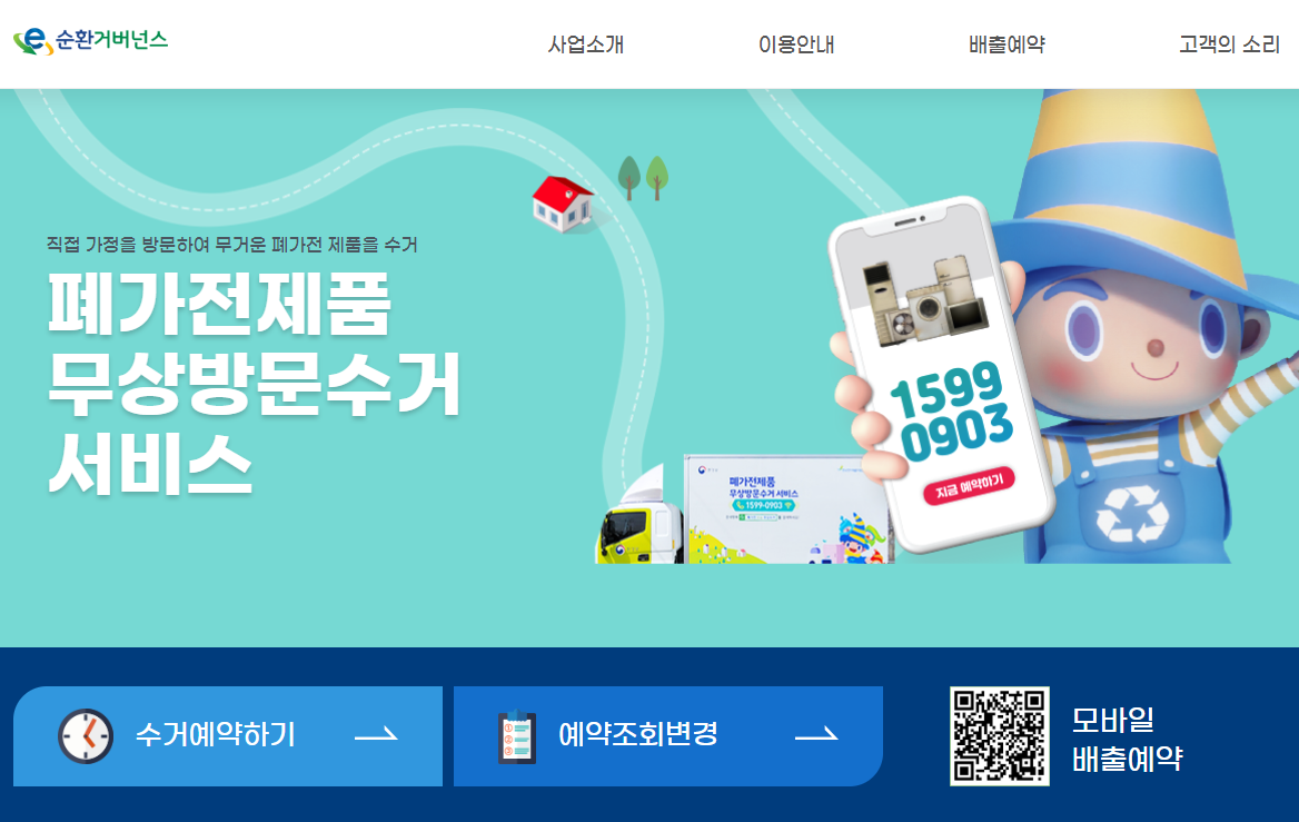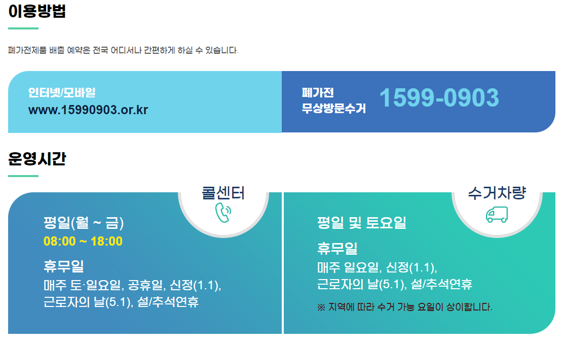 이러한 수거방법은 인터넷이나 모바일로도 가능하며 전화로도 예약이 가능합니다. 운영시간은 평일(월~금) 08:00 ~ 18:00까지이며 수거는 매주 일요일과 신정(1.1) 근로자의 날 (5.1), 설/추석연휴에는 불가능하니 이점 꼭 참고하시길 바랍니다.