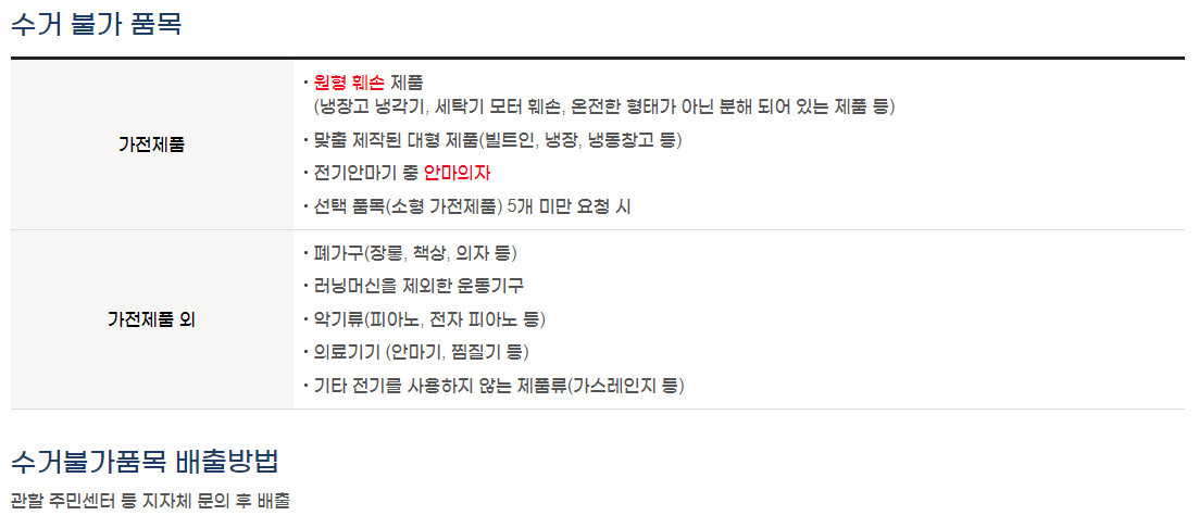 수거가 불가능한 품목도 있습니다. 가전제품의 경우에는 원형이 훼손된 제품 (세탁기 모터훼손, 냉장고 냉각기, 온전한 형태가 아닌 분해되어 있는 제품) 은 수거가 불가능하고 맞춤 제작된 빌트인 냉장고, 냉동창고같은 대형제품 또한 수거가 불가능합니다. 안마의자 또한 불가능합니다.