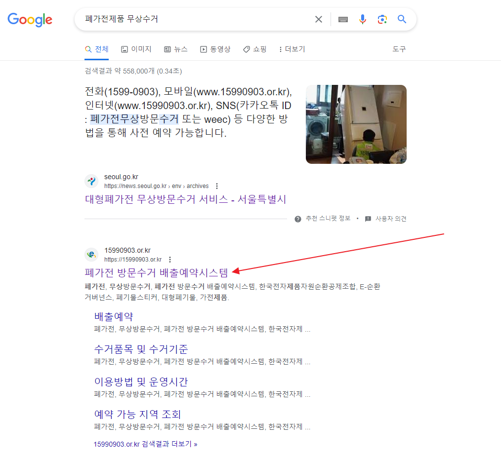 1. 인터넷에 폐가전제품 무상수거를 검색하여 두번째 페이지에 접속합니다.